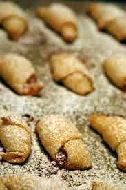 Az alapanyagokból rugalmas tésztát gyúrok, nyújtom, háromszögeket vágok belőle, házi baracklekvár pöttyöt ültetek a széles végibe és jól feltekerem. Sütőpapíros tepsire fektetem és 180 fokon világosbarnára sütöm. Melegen porcukorral hintem.