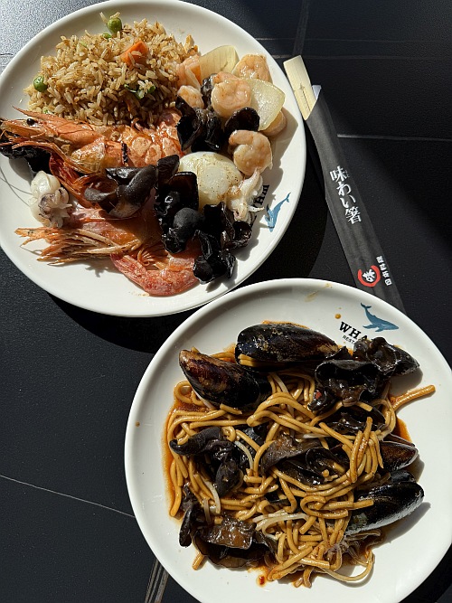 A wokhoz és a grillhez is csak a pultok alatt pihenő tányérok egyikére kell gyűjteni, amit megkívántunk, majd a megfelelő sorba beállva kivárni, amíg a szakácsok készre sütik, wokosítják az általunk választott finomságokat.
