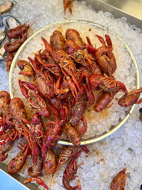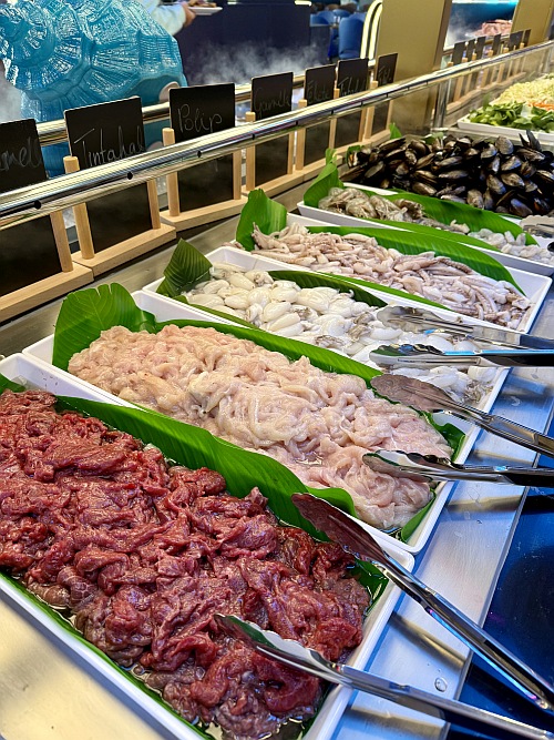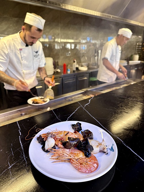 A szakácsok mögötti kétoldalú pulton sorakoznak a főtt ételek, a hazai ízek kedvelő különféle egytálak, pizzák, raguk, köretek közül választhatnak, bőven van mit. A legizgalmasabb azonban a következő pultsor, ahol a grillhez és a wokos fogásokhoz választható ki minden, amit csak szeretnénk. Számtalan zöldség, előkészített tészta mellett a friss húsok, halak és tengeri herkentyűk egész sora vár, zöldkagyló, többféle rák, halak, tintahalak (erre ugye a magyar kicsit kevés szóval bír, de akad ebből is több verzió), nyársra húzott apró rákok, halfilé és a tengeri választék után ott a bárányborda, a marhahús, sertés, csirke, valamint a béka, ha valaki Virágékhoz hasonlóan békapecsenyére vágyik.