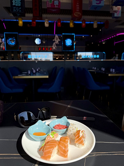 Javaslom, hogy első körben mindenki járja körül az összes pultot, adjon időt magának felfedezni, hogy mi mindennel is van dolga. Vannak levesek, mellette ott készülnek folyamatosan a friss sushik, tekerik a makikat, a nigirik szép sora pihen a tálakon, akad lazacos, tigrisrákos, avokádós és ezernyi másféle is.