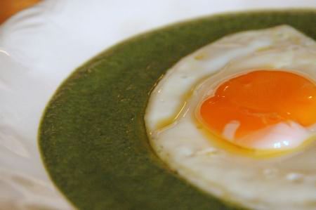 Ezek után a kifliket apróbb darabokban a spenótba dobom, várok egy keveset, amíg megszöttyed, majd újra a botmixerhez folyamodom és egységbe mixelem a főzeléket. Sózom, hozzáadom a tejszínt. Rottyantok rajta egy keveset és tükörtojással tálalom.