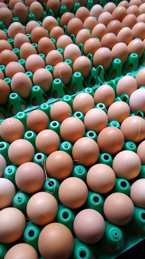 A különféle színkóddal ellátott tálcákon lévő tojásokat fertőtlenítik, a gépben lévő kamerarendszer kiválogatja a törötteket, a horpadtakat, megjegyzi, hogy melyik tojás piszkosabb a kelleténél, a törésdetektor megtalálja a hajszálrepedteket. A hibásakat a masina különszedi, a hibátlanokat méretezi és az istálló jellegének és helyének megfelelő kóddal látja el.