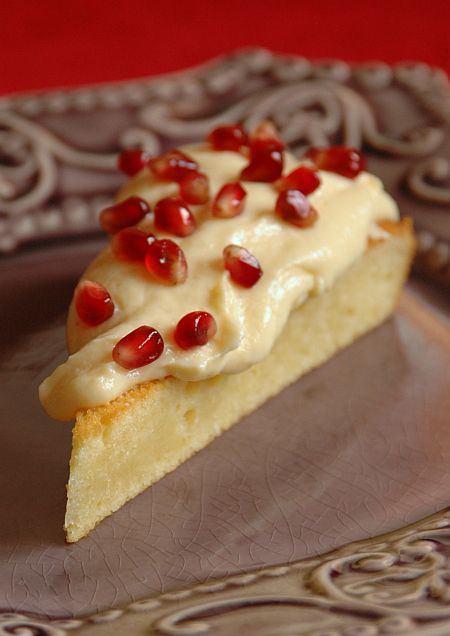 A kész tortát rácsra teszem. Mikor már langyos, akkor tányérra tolom, szeleteket vágok belőle, ezeket megfejelem a kihűlt krémmel és sok-sok gránátalmamaggal pettyezem.