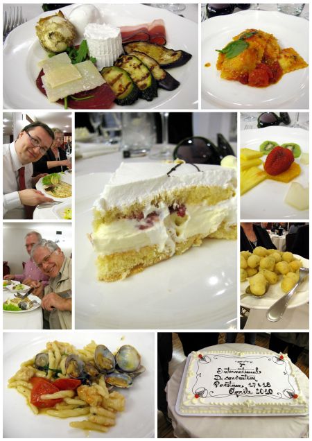 Ettünk friss helyi bivaly mozzarellát, meg sonkákat, ricottát. A tálon szereplő ételek önmagukban is egy kiadtak egy komplett adag vacsorát, de a java még csak ezután jött. Kaptunk tortellinit ricottával töltve, bazsalikomos paradicsommártásban, aztán jött egy kis kagylóval, rákkal körített tészta, majd saláta és grillezett hal került elénk, végezetül jött a torta. Ami bravúros volt. Könnyű piskóta, krémes, lágy vaníliás töltelék, szamócákkal tűzdelve és tisztes tejszínhabpaplan a tetején. Nem lehetett nem megenni, pedig már egy cseppet sem voltunk éhesek.