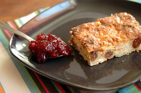 Zsírozott, morzsával kiszórt tepsiben, 190 fokon, szép barnára sütöm. Meggylekvárral kínálom.