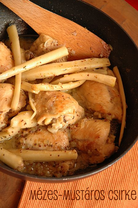 A vajat egy mély serpenyőben (esetemben egy lapos fenekű wokról beszélhetünk) megolvasztom. A csirkék bőrét lenyúzom és a vajon lesütöm őket, amíg egy kicsit meg nem pirulnak. Addig míg alakulnak a csirkék, apróra vágom a hagymát. a kész húsokat kikapom a vajból és a hagymát zúdítom a helyére, közepes tűzön dinsztelem. Eközben megpucolom a fehérrépát, nagyobb – közel azonos – darabokra metélem, majd elkészítem a mártást. Az alaplevet elkeverem a mustárral és a mézzel.