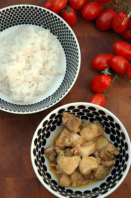 Közepes lángon, fedő alatt főzöm a húst, amíg meg nem puhul, ekkor kicsit sózom, majd rizzsel körítve tálalom.