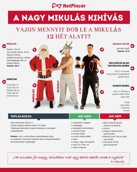 „A valódi életmódváltás csak keveseknek sikerül. Egy éjszaka alatt a Föld összes gyerekének ajándékot vinni nem semmi teljesítmény, most mégis úgy tűnik, a Mikulás túlvállalta magát. A próbálkozások nagy része pont ezen bukik el. Heti 3 edzéssel és egy jól átgondolt étrenddel már komoly eredményeket érhetünk el középtávon is, és higgyétek el, a legtöbbeknek nem is az edzés, hanem az étrend betartása okozza a nehézséget. Ezért annyira egyszerű szabályrendszert állítottunk fel, amennyire csak lehet, ezt viszont be kell tartani. Ha nincs érkezésed főzni, vagy csak szimplán változatosságra vágysz, inkább rendelj néhány mozdulattal valami friss kaját, de ne csalj, ne hagyj ki étkezést!” –kommentálta Borsos Péter a szokatlan felkérést.