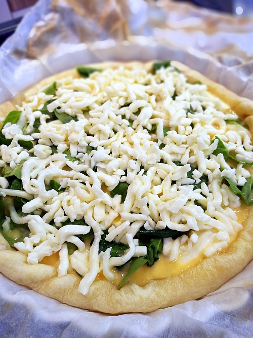 A quiche szélét a piteformába visszacsavartam, majd vaksütöttük nagyjából 10 percig. Addig Kata elkészítette a tojásos-tejszínes öntetet, én a végére értem az összeverődött közönség számára rögtönzött „hogyan pucoljunk spárgát” kiselőadásnak, így a quiche alját megpakoltuk darabolt fehér spárgával, tettünk mellé kockára vágott fetát, jöhetett a bébispenót, majd a tejszínes tojás és végül az elmaradhatatlan mozzarella. Aztán irány a sütő, ahol 180 fokon hagytuk, hogy szép aranybarnára piruljon a tésztánk.