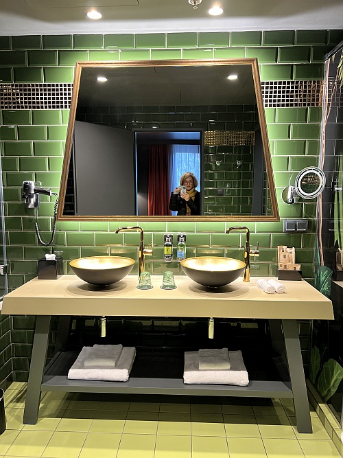 Az arany lamellák, az erős, koncentrált dekorfény, az antik kultúra ábrázolásaiból ihletett merített falidekorok, a fürdőszoba megrendítően szép metrócsempéje (az az zöld…), az arany folyamatos áramlása körülöttem a letisztult szobát meleggé, otthonossá tette.