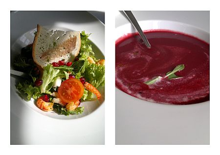 Szerencsére az első fogás viszonylag tempósan érkezett. Anya taleggios tormahabbal koronázott céklalevest kapott, elém egy édesvízi rákkal gazdagon megszórt saláta került. Mindkettő mennyiségében, minőségében szép indítása volt az ebédünknek. Amíg ettünk, a terem lassacskán megtelt. Az akción felbuzdult párok, turisták tértek be ebédelni, bár néhányan kellően bátrak voltak ahhoz, hogy a naposságával kecsegtető, de igen szeles teraszon vívjanak meg az elemekkel.