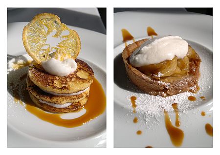 A főételt követően jöttek a várva várt desszertjeink. Ha valami problémát okozott a menü kiválasztásakor, akkor az a desszert volt. Nem tudtam hogyan teszek jobbat magamnak, hiszen mind a tart tatint nagyon kedvelem, mind a crêpe suzette-t. Végül a főfogás alapján döntöttem, s így desszert gyanánt a narancsos palacsinta landolt előttem . A klasszikus crêpe suzette-tel ellentétben a desszertem amerikai palacsinta alapokon nyugodott, de ez nem vált hátrányára, sőt a tetején pihenő, roppanós narancskarikával egészen tökéletes egységet képzett.