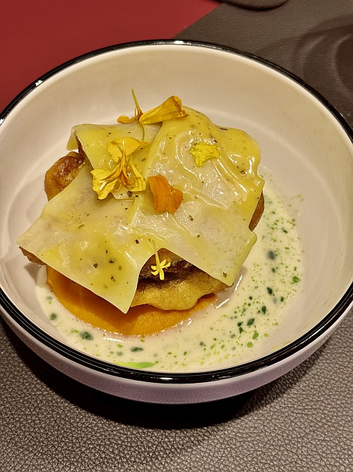 A vacsora számos meglepetést tartogatott. Apró, sharingre (megosztásra) alkalmas fogásokban gondolkodik a konyha. A lényeg az ízekkel való ismerkedés. Egy vendég számára nagyjából három “small plate” ad ki egy kellemes étkezéshez elegendő adagot. Az ázsiai fúziós konyha jól használja a magyar alapanyagokat is, meglepő, új arculatot teremtve nekik. Ügyesen játszik a textúrákkal, fiatalos hangvétellel, érett megoldásokkal.