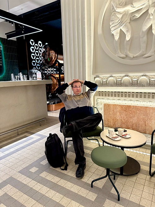 Boldogan falatoztunk, néztük a teret kint és bent, a Blaha zajlott a maga megszokott medrében, bent pedig – a szerdai koradélután ellenére – folyamatosan érkeztek a vendégek, lehetett bőséggel hallani magyar hangokat, de a budapesti kínálatra kíváncsi külföldiből is akadt bőven.