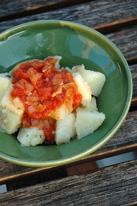 A krumplikat megpucolom, enyhén sós vízben felteszem főzni. Kevés olíva olajon megdinsztelem az apróra szelt hagymát. Amikor már majdnem jó, akkor hozzáadom a szintén apróra vágott fokhagymát. Erre jön a kakukkfű, a felszelt chili. Kicsit megfuttatom az olajon, majd hozzáadom a paradicsomot, sózom, borsot tekerek rá, majd fedő alatt takarékon rotyogtatom.