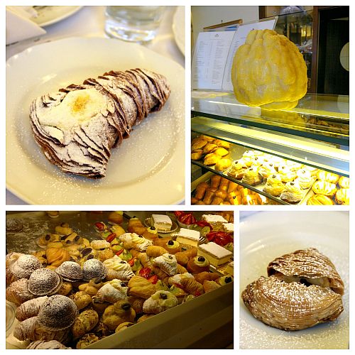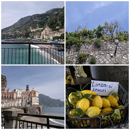 A tömeget leszámítva a hely azonban gyönyörű. Az úton citromligeteken jöttünk keresztül, a felettünk nyúló sziklaperemekről hatalmas citrusokkal terhes fák hajoltak az út fölé. Miután a kikötő környékén sikerült leparkolnunk rájöttünk, hogy a 1600 km-es hazaúttal tarkított napunkba Capri nem fog beleférni, így inkább Amalfiban sétálgattunk, az üzleteket bújtuk, bejártuk a bazilikát és a főtéren betévedtünk a Pasticceria Pansa-ba, ahol étcsokoládéba mártott mogyorós tallért, azaz tegole-t ettünk és megkóstoltuk a sfogliatellát, ami egy helyi eredetű sütemény. A leveles tésztából kialakított kagylóba sokféle krémet töltenek, kóstoltuk narancsos ricottás töltelékkel, illetve citromos tejszínkrémmel töltve is.