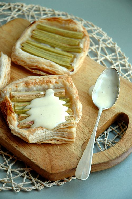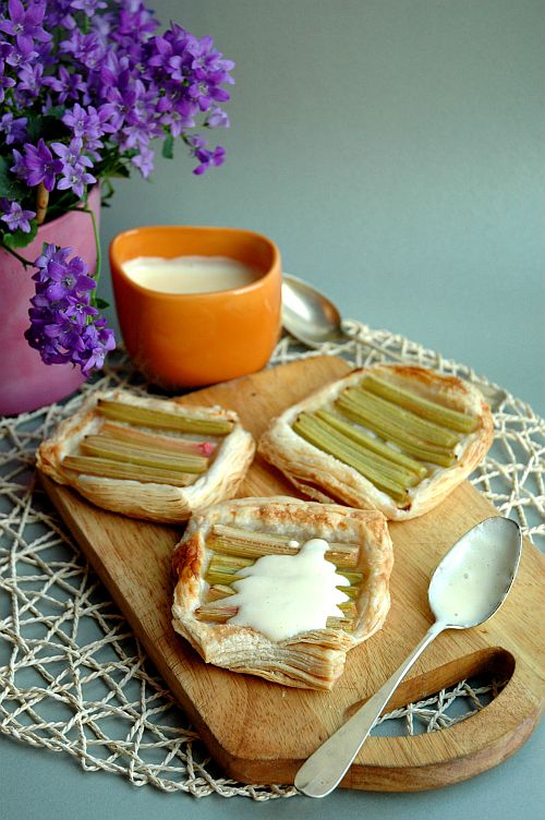 A felengedett leveles tésztát lisztes deszkán kinyújtom és 8 négyzetre vágom. A rebarbarákat egy éles késsel vagy zöldségpucolóval megpucolom, majd a tésztanégyzeteknél rövidebb darabokra metélem. A rebarbaradarabokat félbe vágom, majd a tésztára fektetem őket és egy-egy teáskanálnyi cukorral megszórom.