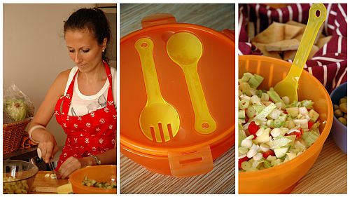 Érdekes módon nálam a grillezésben a meggrillezett hús mibenléte a legkevésbé izgalmas. Valószínűleg a látens vegetáriánus mivoltom az oka, de én már a füsttel jól tudok lakni, s inkább a zöldségekre koncentrálva telik az estém. Most is főleg a salátákat ettem, nagyobb adag tzatzikit és a görög saláta alapokon nyugvó vegyes salátánkat, amit egy újszerű és jópofa edényben tálaltunk. A praktikus tálkának az aljába található hűtőakku biztosította, hogy ne melegedjen fel a köret és a tál pattintható fedele, a bele épített evőeszközök pedig tökéletesen alkalmassá tették, hogy ide-oda hurcoljuk, anélkül, hogy kifolyna belőle az étel.