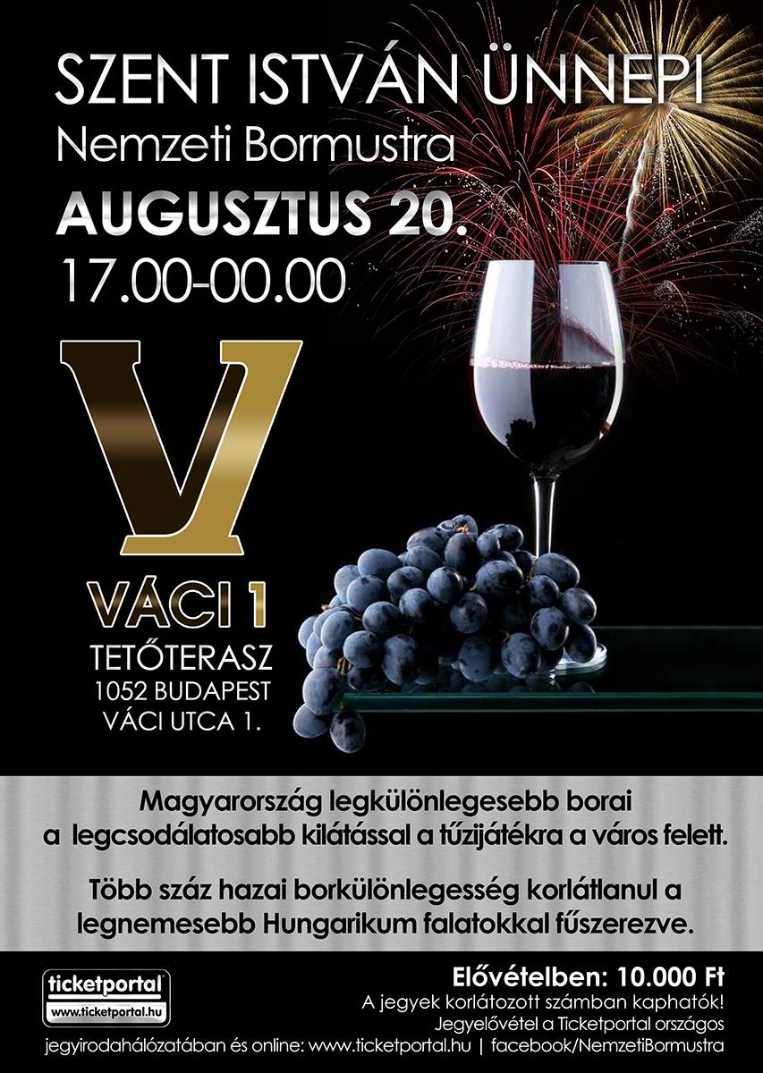 Ha igazán ideális programot keres valaki 20-a estére, akkor csak javasolni tudom a Nemzeti bormustrát, amely Magyarország legszebb üzletházának tetőteraszán kerül megrendezésre. A vendégek ezen a rendezvényen ugyanis a csodálatos panorámától övezve, az esti tűzijáték fényeibe vonva az ország borainak legjavát kóstolhatják.