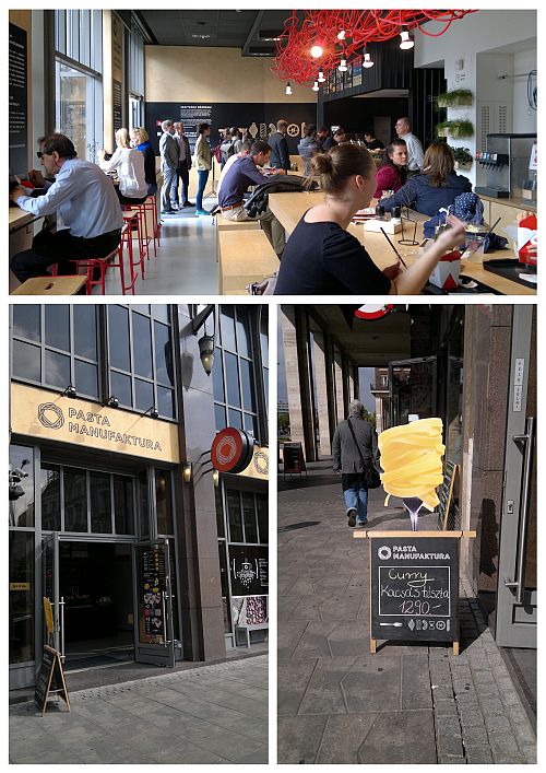 A Pasta Manufaktura nem csak egy gyors ebéd erejéig látogatható, a viszonylag nagy tér úgy lett kialakítva, hogy munkaállomásként, vagy traccspartik helyszíneként is funkcionáljon. Az étkezésre szánt tér közepét elfoglaló közös asztal mellett az ablaknál lévő bárpultok székeiről a belvárosi panorámában is gyönyörködhetünk, illetve a terem végében lévő egyszemélyes kuckókban elmélyedhetünk a saját kicsiny világunkban is.