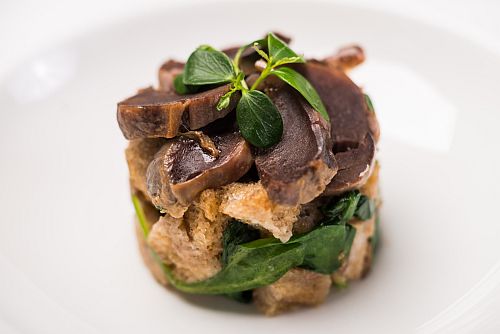 A kenyereket beszállító Marmorstein pékség kiváló pékáruira építve új elemként jelenik meg a hideg előételek sorában a Finomságok a spájzból, de természetesen kihagyhatatlan és megkerülhetetlen a remek zsidó tojás is. A meleg előételek között üdvözölhetjük a tökéletes, omlós, egészen új értelmezést nyerő lassan sütött libazúzát, ami igaz pecsenyehús élményt kínál. Az omlós húsnak kellemes ellenpontja a pirított diós kenyér és a hozzá kínált bébispenót.