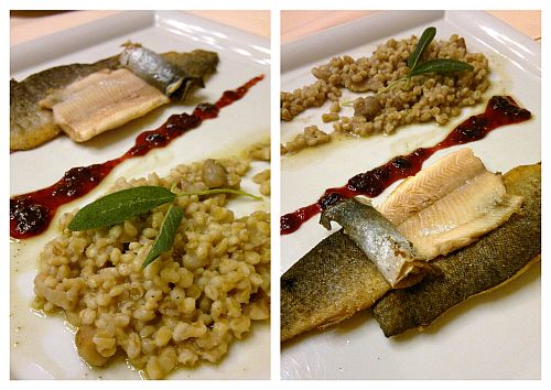 A kiadós előételek mellé a Nyakas pincészetből való Budai chardonnay-t kortyolgatunk, majd következnek a főételek. Mivel mindketten szeretnénk mindenbe belekóstolni, így megbeszéljük a személyzettel, hogy egymás után kérnénk szépen a fogásokat. Kérésünknek megfelelően azonnal plusz terítéket kapunk és első körben megkóstoljuk a szilvásváradi felhozatalból származó – a chef aktuális ajánlatában szereplő – grillezett pisztrángot, amihez gesztenyés gerslirizottót kínálnak. Az előételek után, újabb letisztult, felesleges sallangoktól mentes, az ízeket tisztelő fogás érkezik az asztalunkra. A hal hibátlan, az alaplében főtt, szaftos gerslirizottó állaga tökéletes, s a halhoz kínált erdei gyümölcsökből készített lekvár is stimmel a zsályával fűszerezett, édeskés, de nem édes körethez.