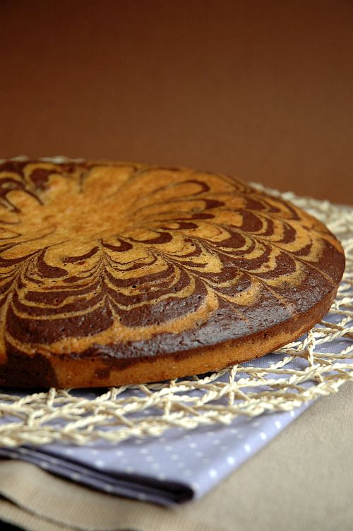 A vajat a cukorral habosra keverem, majd hozzáadom a tojásokat, s azzal is átkeverem. A liszteket kimérem, belekeverem a sütőport és a fahéjat is, s a vajas keverékhez adom, amit tejjel lazítok. Az elkészült tésztát megfelezem, az egyik felébe belekeverem a kakaóport. Ezután egy nagyobb tortaformát kibélelek sütőpapírral, majd a tortaforma közepébe felváltva belekanalazom a kétféle krémet. Semmi más dolgom nincs, csak hol az egyik, hol a másik tésztából egy nagy evőkanálnyi a kupac tetejére biggyeszteni, a tészta súlya gyönyörűen, csíkokba rendezve kitölti a formát az én közreműködésem nélkül. Ha elkészültem, akkor egy hústűvel kicsit megdekorálom a tészta tetejét és 180 fokon tűpróbáig sütöm a tésztát.