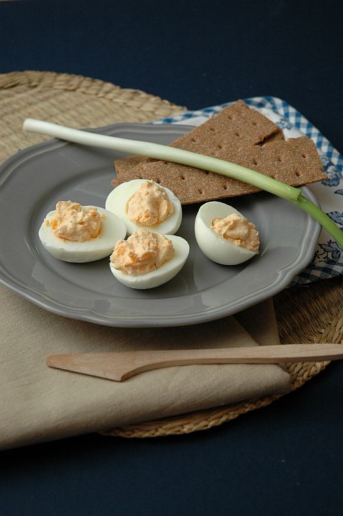A tojásokat megfőzöm, majd megpucolom és szépen félbe vágom. A sárgáját ügyesen kidöccintem egy tálba, majd sajtkrémet adok hozzá, finoman fűszerezem, s addig keverem, amíg a homogén krémet nem kapok. Ezután a krémet a fehérjekapszlikba töltöm, majd tálra teszem. Újhagymával kínálom, s mellé ropogós lapos kenyeret adok.