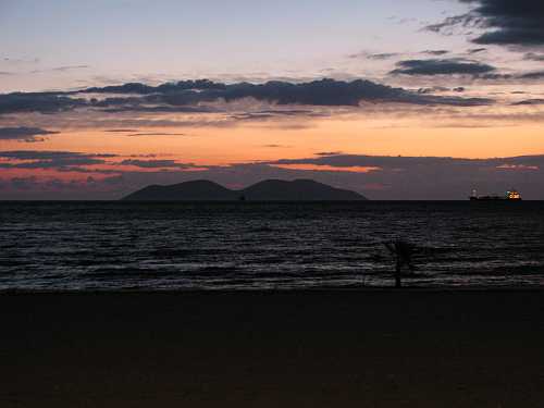 Vlorában még szereztünk a Nőknek egészségtelen rácskát (pattogatott kukorica), majd a naplementében egészen fenséges színekben játszó Karaburun és Sazan mellett hazasiettünk a sötétbe borult tengerparton.