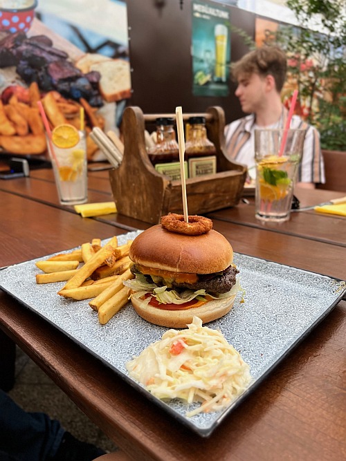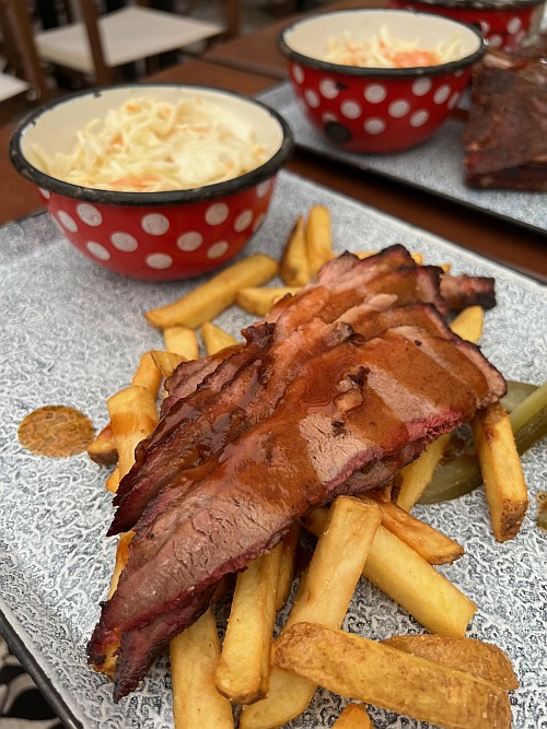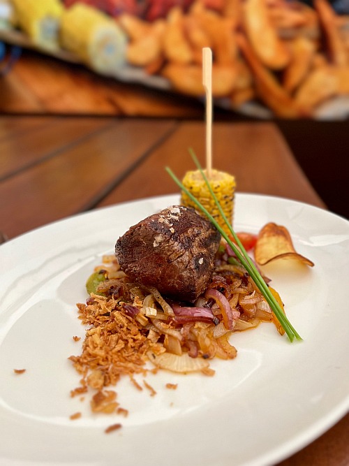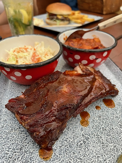 A nyári lazaság, a szezonalitás, a slow living jól érezhető irányvonala az étlapoknak (amiből a szezonban kettő is akad), a foodtruck saját kínálatából igazán könnyen szemezgettünk is. Edömér a tépett hússal gazdagított burrito irányába indult, én nemes egyszerűséggel leragadtam a grillezett húsoknál, izgalmasnak ígérkezett a kínálat, engem már a grilltételek felsorolásával meggyőztek. Nem is csalatkoztam, az elém érkező, street food konyhákra jellemzően laza, de igényes tálalásban csirkemell, fokhagymás-mustáros karaj, rablóhús, grillkolbász került elém friss kevert salátával és sült csónak krumplival, amit némi burgerszósz tett teljessé és vonta el a húsokról a figyelmemet az első pár percben. Aztán ahogy kitunkoltam a megfelelő mennyiségű krumplival a kellő mennyiségű szószt, utána már élvezettel válogattam a széles kínálatban, miközben a nap finoman lehanyatlott a budai hegyek mögött.
