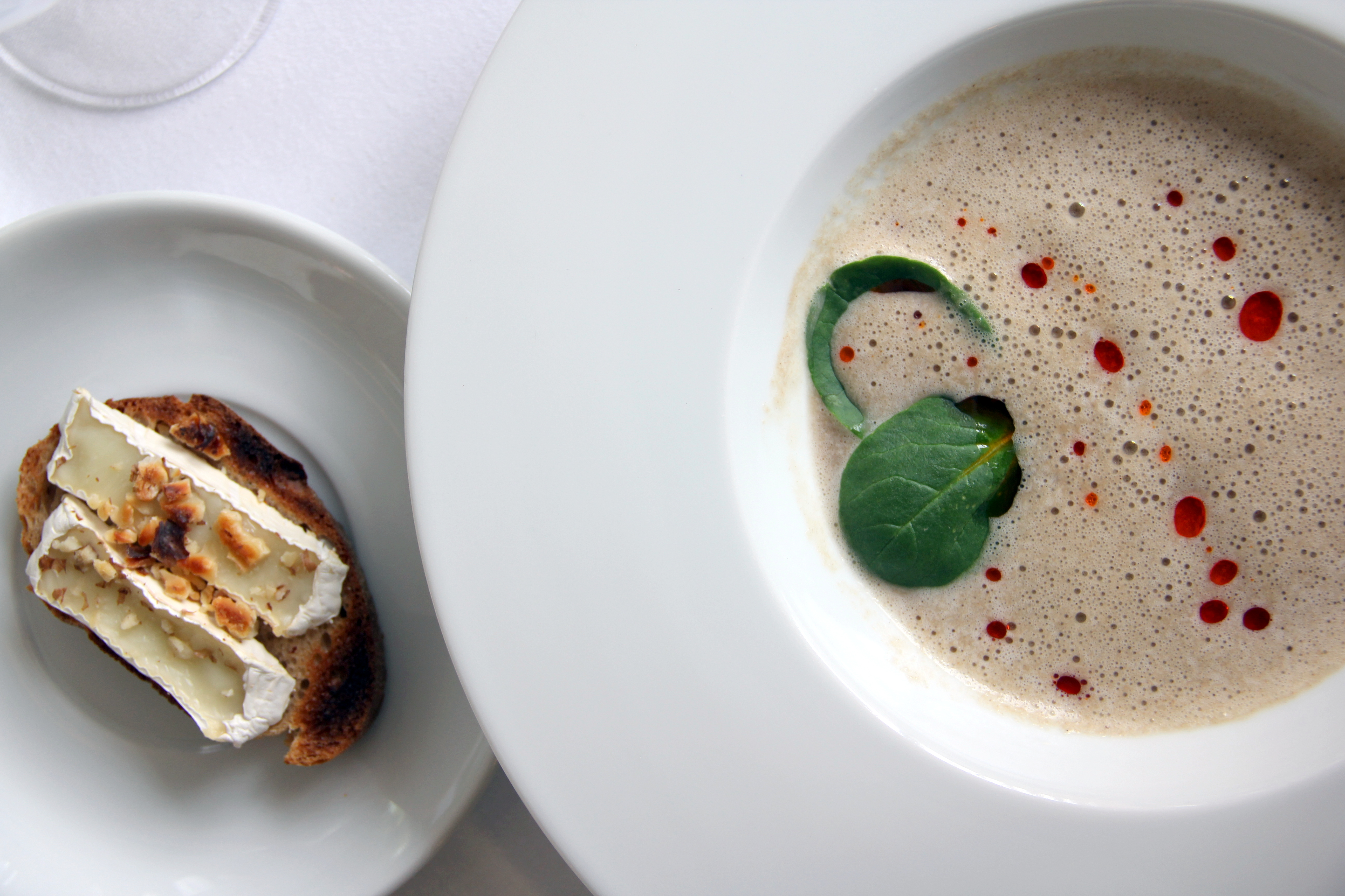 Az előételt leves követte, a férjem boldogan rendelte meg a fácánlevest, én pedig a szezonnak megfelelő gombakrémlevest választottam. Az erdei gombákból készített krémleves könnyű volt, nem a szokásos túlságosan is tartalmas, majdnem főzelék állagú étel volt, hanem egy vargánya illatú könnyű, mostanában cappucino-ként is aposztrofált fogás, amelynek az ízében már a többi gomba is szépen megjelent, a vargánya mellett helyet követelt magának a rókagomba, a helyi termelőtől érkező laska, s a tőkegomba is. A letisztult leves betét nélkül érkezett, ám koránt sem egyedül, hiszen camembert sajtos, diós pirítóssal kínálták, amit valóban érdemes volt mellé harapni. Íze és textúrája is jól kiegészítette a levest.