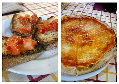 A vacsorára szerencsére nem kellett sokat várni. Kemencében pirított crostinivel mentették meg az életünket, majd könnyed, kissé karcos asztali bort is kaptunk, végezetül megérkeztek a tökéletes pizzáink. Mellé salátát faltunk (az olaszok ezt is furcsállva nézték) és boldog elégedettségbe merülve nyakaltuk a bort.