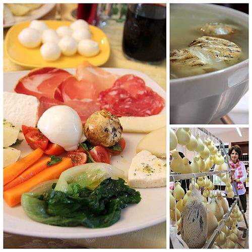 Másnap szabadnapunk volt és mivel komoly tervekkel vágtam neki az útnak, így reggel – Murphynek hála – szakadó esőre ébredünk. A reggeli környékén még bíztunk benne, hogy holmi futó zápor locsolja a környező dombokat, majd néhány órányi olvasás, pihenés után nyilvánvalóvá vált, hogy egész napos esőzésre számíthatunk. Így aztán prolongáltam az aznapra tervezett Amalfi- Capri- Ravello programot és helyette Paestumba, egy helyi gazdaságba igyekeztünk, hol a fiúk néhány éve nagyon jókat ettek. A La Frattoria del Casaro vendéglátói ugyan kissé furcsán néztek ránk, mikor déltájt enni kívántunk, de aztán hamar túlestek a döbbeneten és viszonylag tempósan elénk került egy üveg vörös bor, antipastinak szánt aprócska mozzarellagolyókkal, majd jött a degusztációs tál, amelynek legfőbb éke az általam rajongásig szeretett füstös bivalymozzarella.