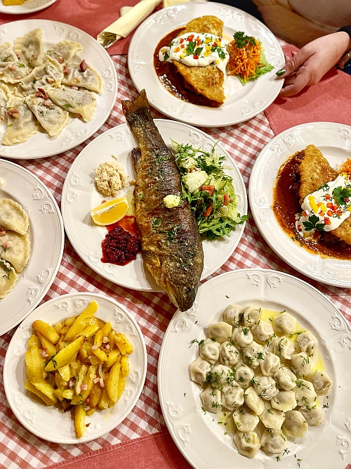 Mi pedig ebéd után néztünk. Lengyelországban gyerekkoromban sem lehetett éhezni, még akkor sem, amikor nem volt hús és a jegyrendszer szabályozta a mindennapokat. Egyszerű, laktató és ízletes fogásokat kínáltak, volt céklaleves, túrós sütemény, almás pite, akadt hal, bab és kovászos uborka, ember nem állt fel éhesen a vendégszerető lengyelek asztalától. Ma ez még inkább így van, Zakopanéban minden sarokra jut 2-3 jó vendéglátóhely, tartalmas fogásokkal, számomra kicsit túlzóan húshangsúlyos ételekkel, de szerencsére a tradicionális góral és lengyel fogások mindenütt tetten érhetőek.