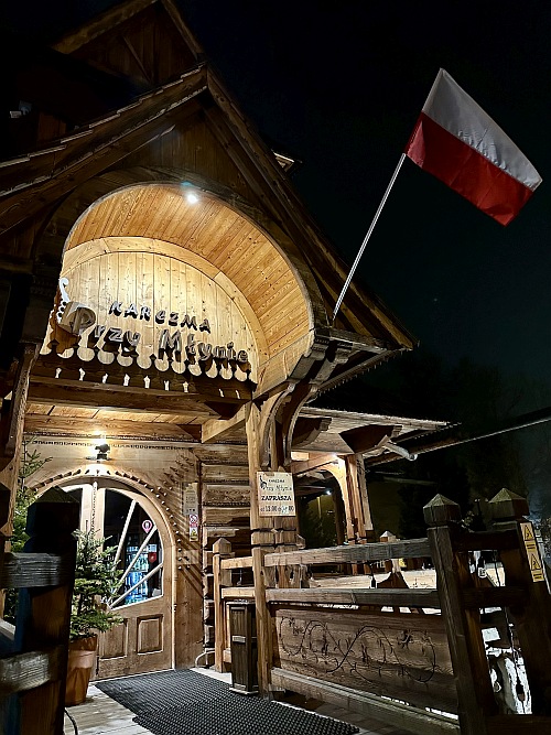 A főutca helyett a sísánc felé vettünk az irányt, ott kanyarodtunk el, ahonnan a hegyekbe vezető utak indulnak, hogy rögvest egy igazán autentikus lengyel ebéddel kezdjük az ottlétet.