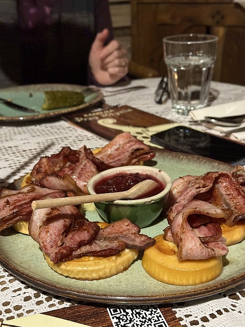 A déli trakta után kissé nehezünkre esett a választás, de készségesen a segítségünkre siettek egy pár közös előétellel, amiből boldogan mazsolázgattunk. Moskolét kaptunk, azaz zab- vagy árpalisztből készült lepényt, amihez fokhagymás fűszeres vaj és juhtúró dukált, smalec (sült húsos zsír) érkezett sok-sok friss kenyérrel, illetve egy nagyobb adag grillezett oscypeket tettek le elénk, pár szeletnyi – szintén sült – sonkával. A grillezett sajt divatja nagyjából 15 éve indult, azóta is töretlen népszerűségnek örvend, ma már a sajtpiacon a góral asszonyok azt is kiírják a sajtjaik mellé, hogy melyik hogyan olvad, ha netalántán grillezve kívánjuk fogyasztani.
