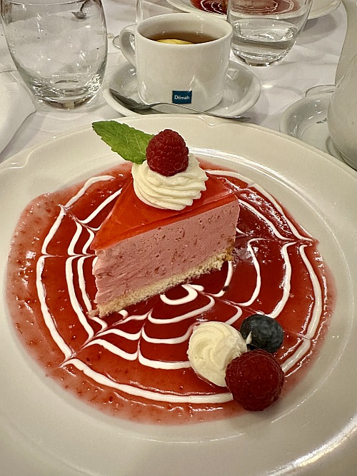 Az előételekkel nagyjából jól is laktunk, szórványos rendeléseinkbe nem roppant bele a konyha, mindenki boldogan csipegette a sajtot, kente a zsírt, ette a juhtúrós lepényt. Én is csak egy pár bögre teát ittam, meg egy jó céklalevest, amit errefelé nem szentségtörés bögrébe, üresen és forrón kérni.