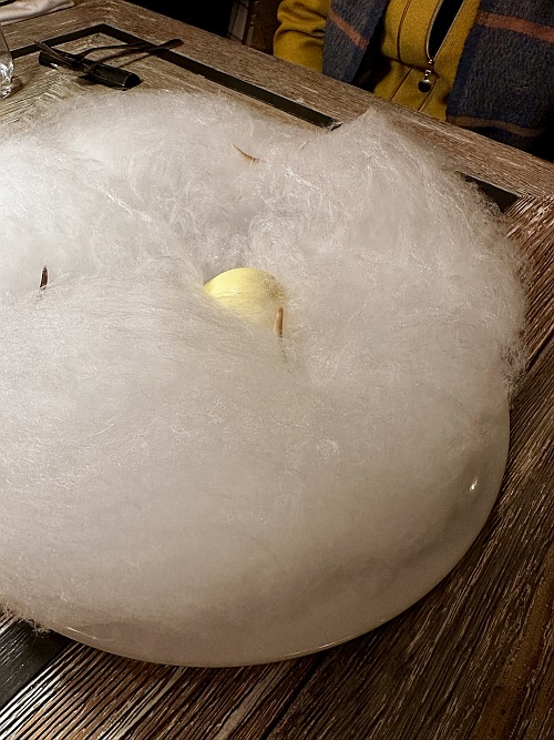 Desszertként pedig a helyi specialitás került elénk, a Szürke Liba, amely vattacukorfelhőbe csomagolt csokoládé lúdtojás volt, most épp mangós krémmel töltve. Elegáns, ötletes és hibátlanul finom.
