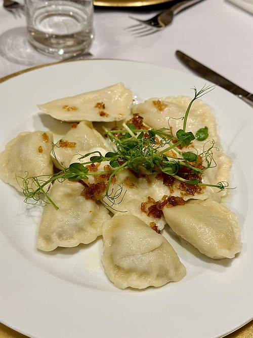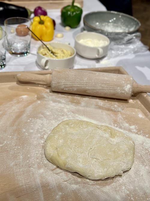 Itt most orosz pierogok készültek, azaz pierogi ruskie, amelyben a töltelék tört főtt krumpli, túró és sült hagyma krumplihangsúlyos keveréke. Vezetőink mutatták, hogy milyen vékonynak kell lennie a tésztának, mennyinek kell lennie a tölteléknek és hogyan kell úgy összecsippenteni a friss tészta szélét, hogy szépen fodrozódjon, de főzés, sütés közben se nyíljon szét.